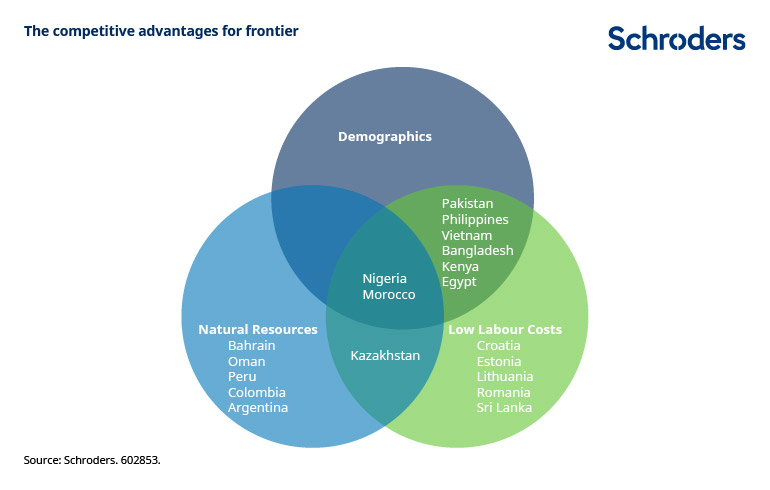 Frontier emerging markets (FEMs) offer some of the most exciting investment opportunities globally. In general, FEMs are countries with smaller, less liquid equity markets that often have reduced operational capabilities and foreign investor access limits. Their competitive advantages lie in low labor costs, young populations, and natural resources. FEMs make up nearly 1 billion people, almost 15% of the global total. Their aggregate GDP is one-eighth that of emerging markets and one-twentieth that of global GDP, but their capital markets are under-represented.